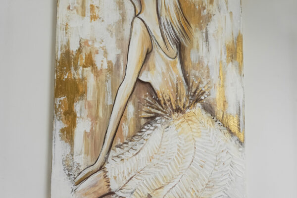 Obraz przedstawia figurę kobiety, która jest sercem kompozycji. Kobieta ma uciętą twarz co wprowadza odrobinę tajemniczości. Jej postać emanuje kobiecą siłą oraz elegancją.